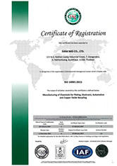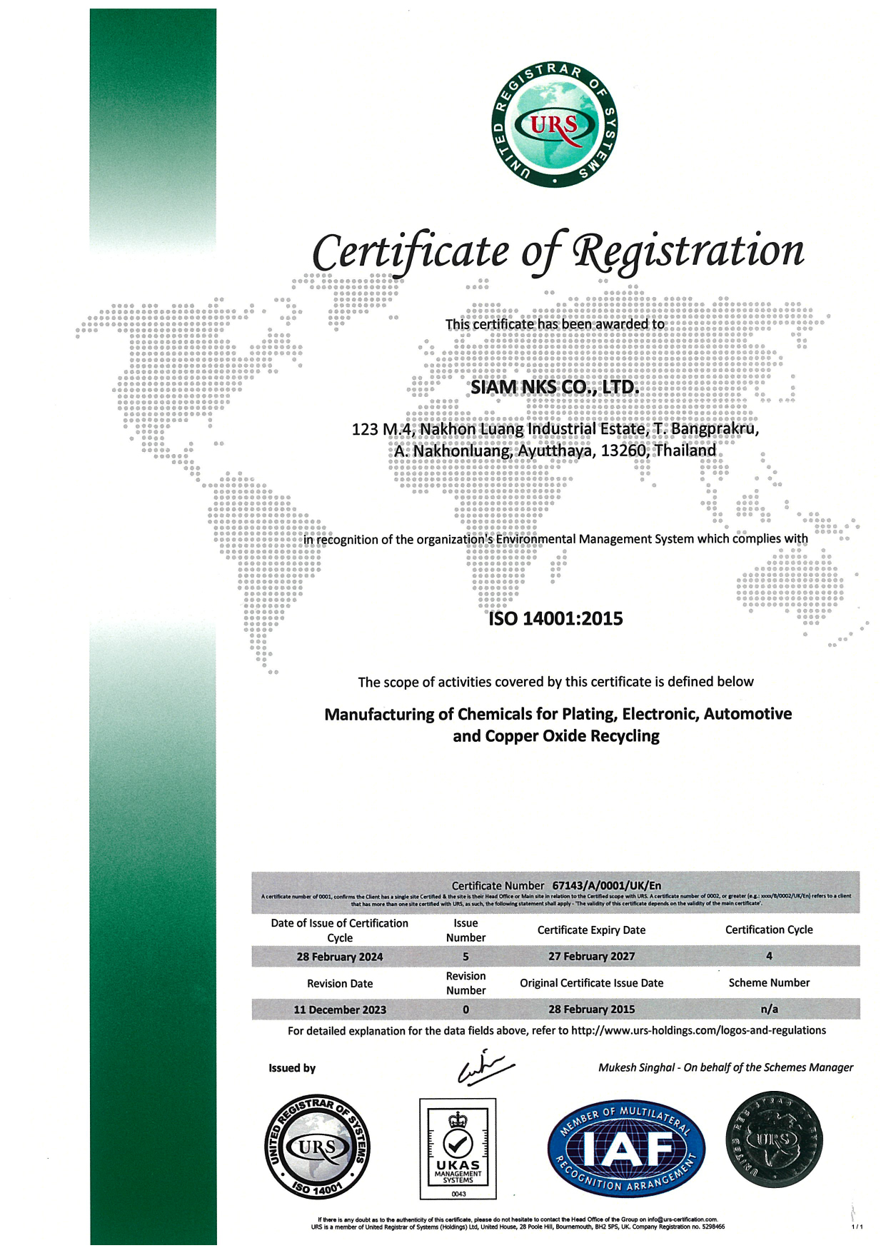 また、タイのSIAM NKS社工場は、URSを審査機関として、2015年2月28日付けで、「ISO 14001」の認証を取得しています。