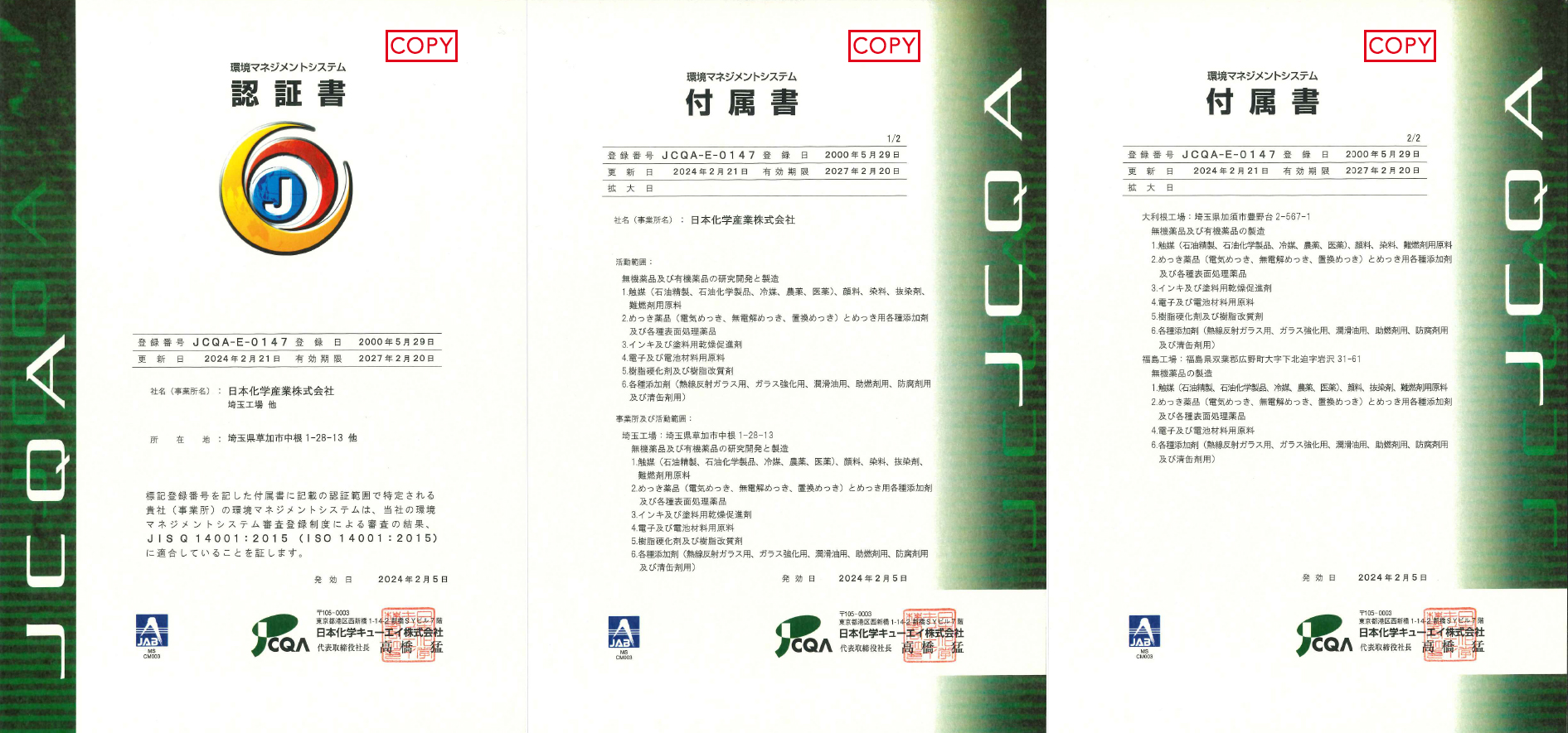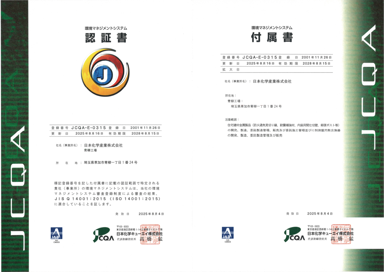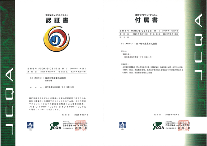 建材本部と青柳工場は、日本化学キューエイ(株)を審査機関として、環境マネジメントシステムの国際規格「ISO14001」を2001年11月26日付けで取得いたしました。これに基づいた環境管理体制のもと、これからも環境に配慮した生産に取り組んでいきます。