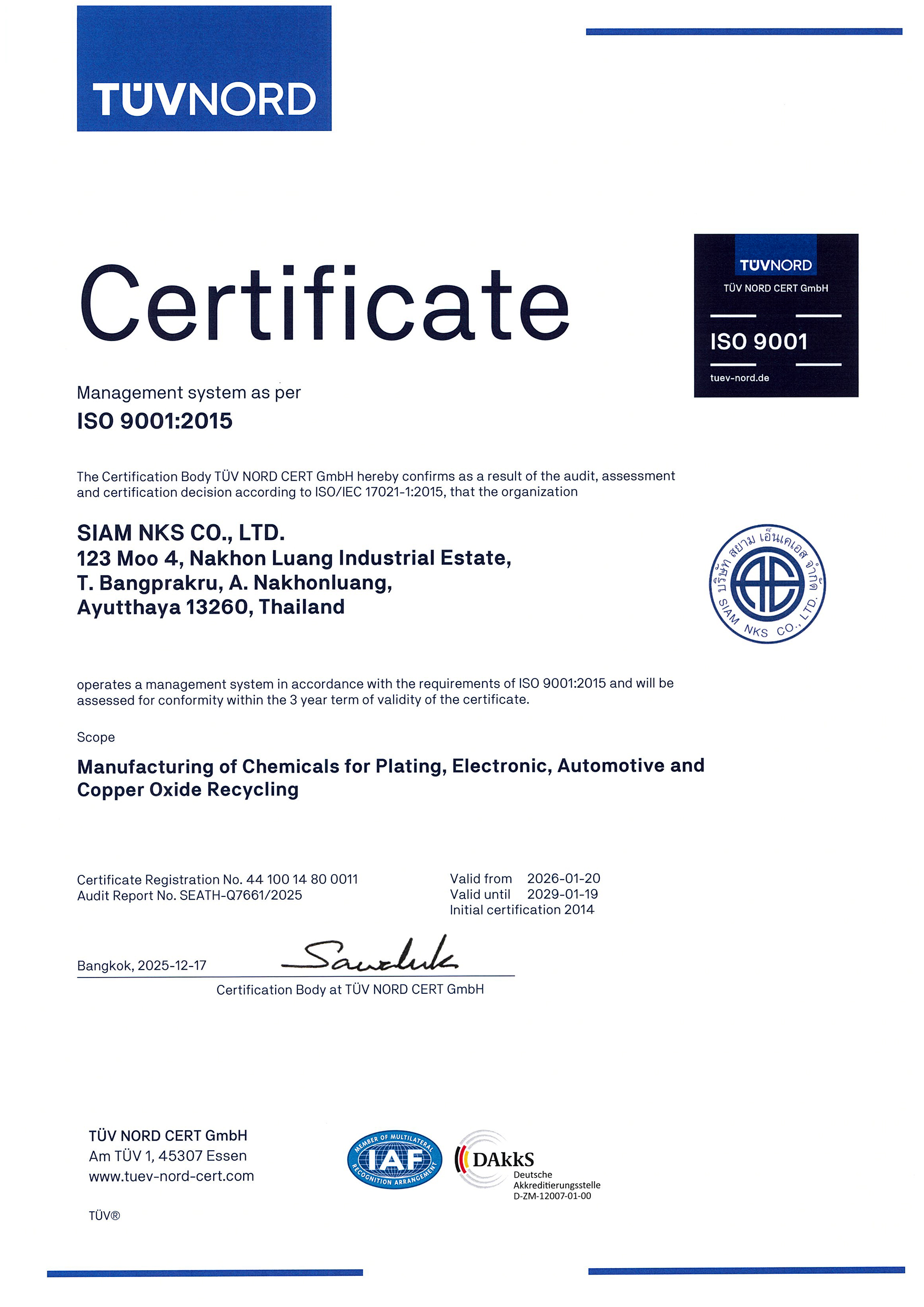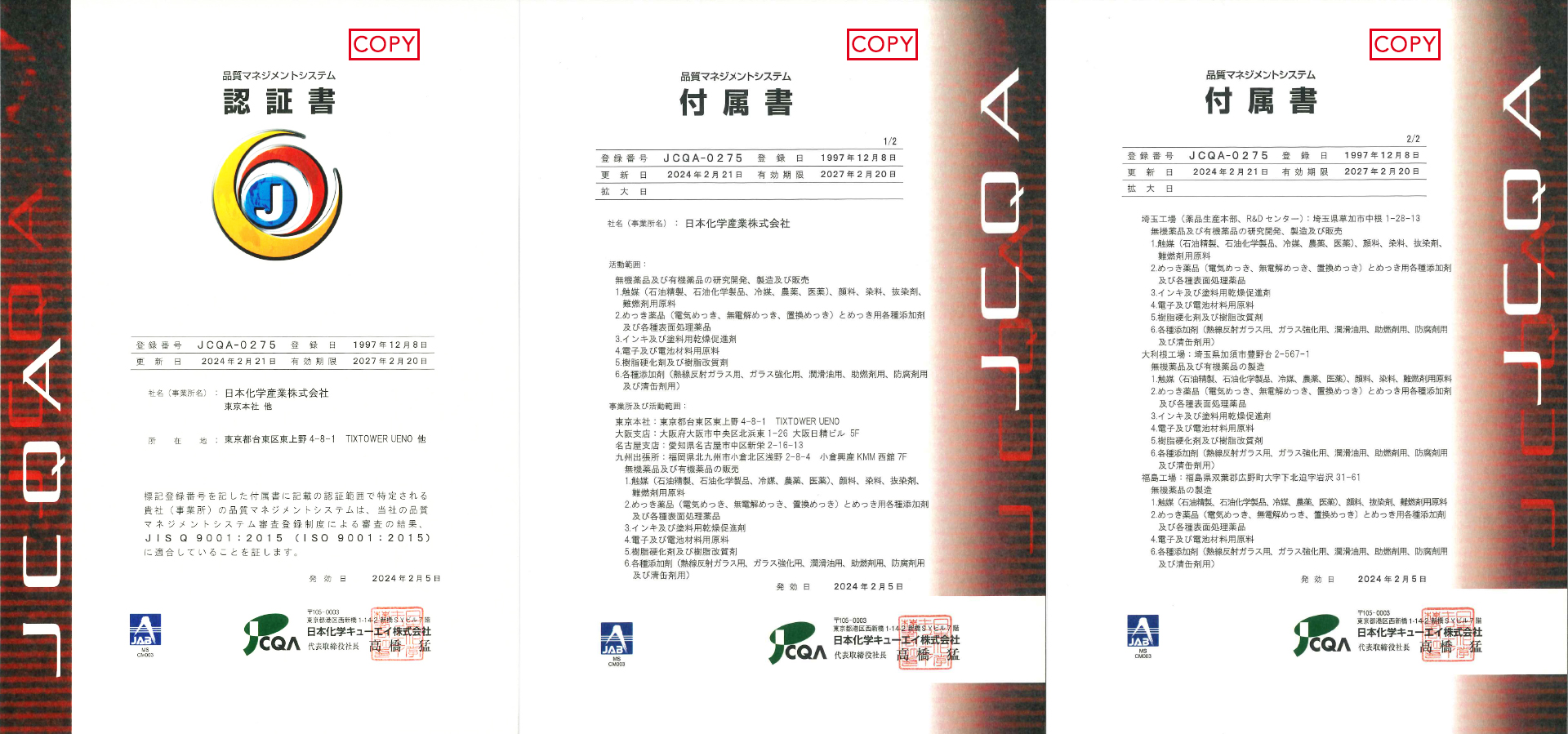 当社は工業用化学薬品メーカーとして、幅広い産業分野のさまざまな用途に向けて、製品をお届けしています。「独自技術により、市場に高い付加価値を提供する、オンリーワンの化学薬品メーカーとなることで、産業界と社会のサステナビリティに貢献する」を基本方針として品質管理に取り組んでいます。日本化学キューエイ(株)を審査機関として、品質マネジメントシステムの国際規格「ISO 9002」を1997年12月8日付けで取得後、「ISO 9001」へ移行し、現在はすべての製品とすべての薬品部門で認証を取得しています。また、タイのSIAM NKS社工場は、TUV NORDを審査機関として、「ISO 9001」の認証を2014年1月20日付けで取得しています。