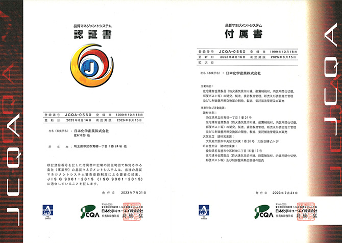 建材事業においては、「品質の向上と安定化を図り、お客様から信頼と満足をいただける製品の提供」を基本方針として、顧客のニーズを的確に捉えた、満足いただける製品を提供できる品質活動を進めています。その一環として、日本化学キューエイ(株)を審査機関として、品質マネジメントシステムの国際規格「ISO 9002」を1999年10月18日付けで取得後、「ISO 9001」へ移行し、その範囲を建材本部、大阪支店および名古屋支店の建材営業課に拡大し、品質管理活動を続けています。