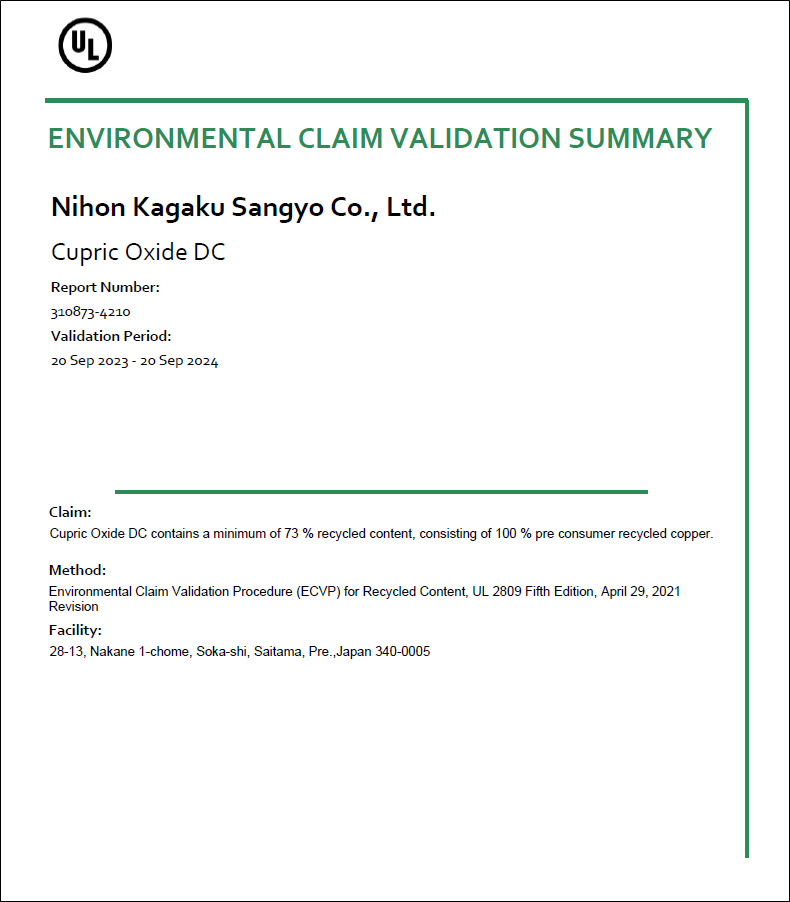 日本化学産業株式会社(社長・柳澤 英二)は、このたび、薬品生産本部埼玉工場(埼玉県草加市)で製造する「酸化第二銅DC」について、第三者認証機関 UL Solutions社による検証が2023年9月に完了し、UL 2809※の認証を取得しました。