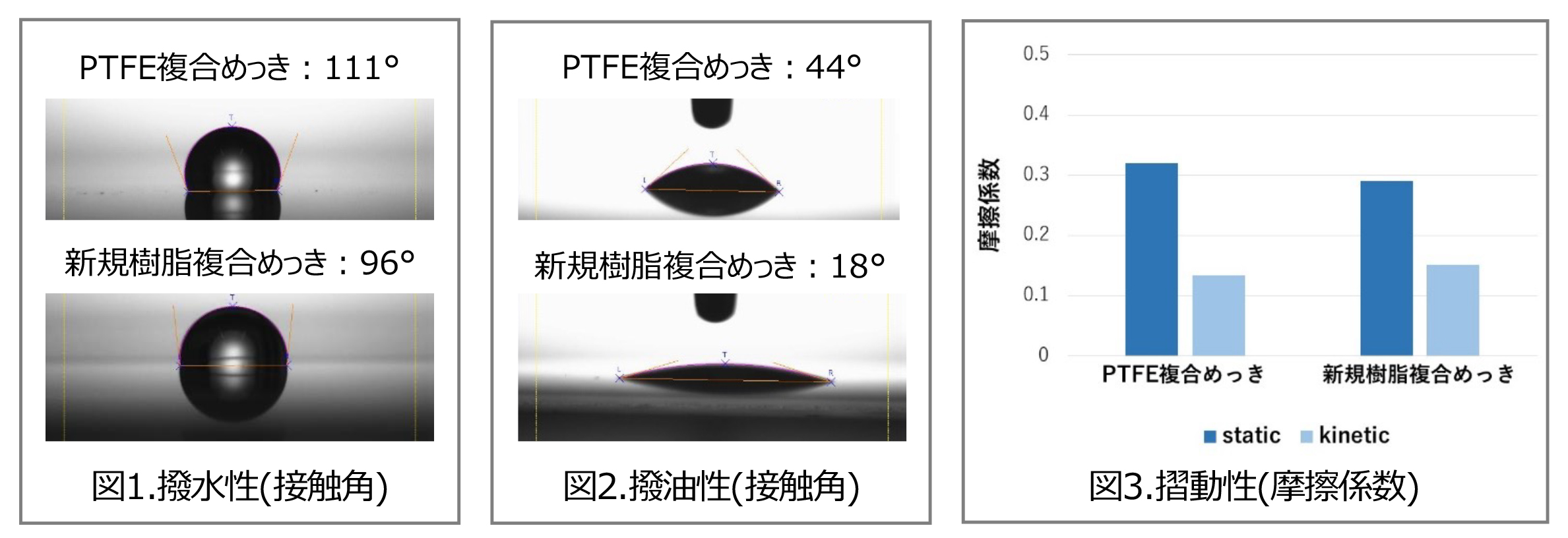 ・撥水性および摺動性は、PTFE複合めっきと同程度の性能。